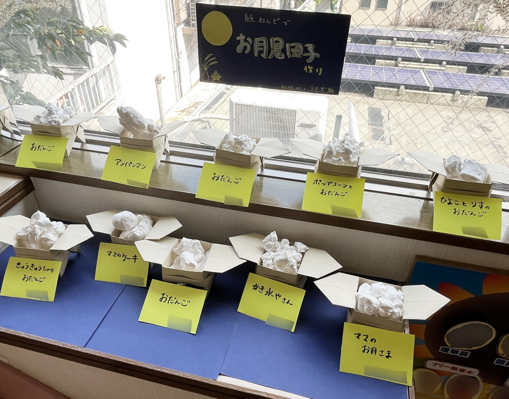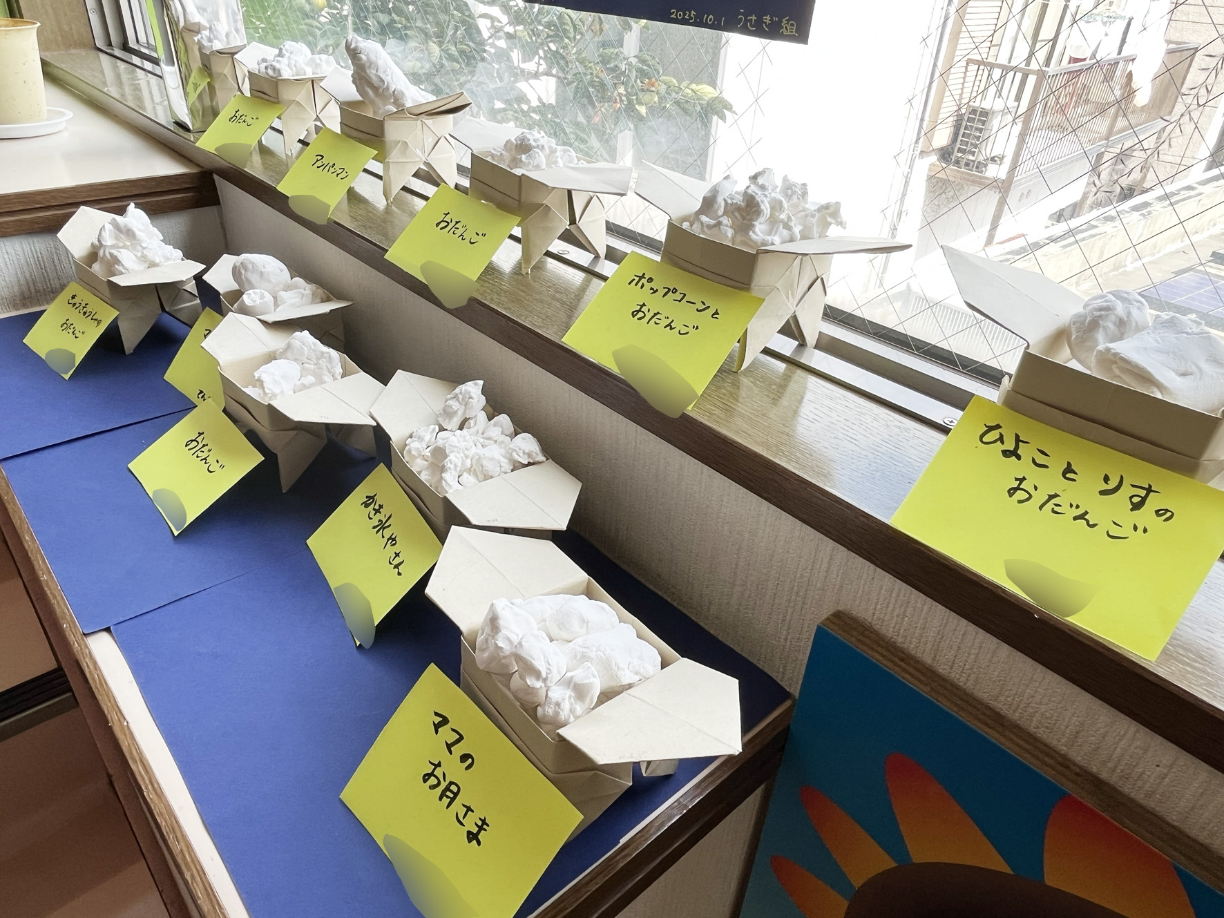紙粘土を丸めたり、伸ばしたり、思い思いの形のお団子を作りました。