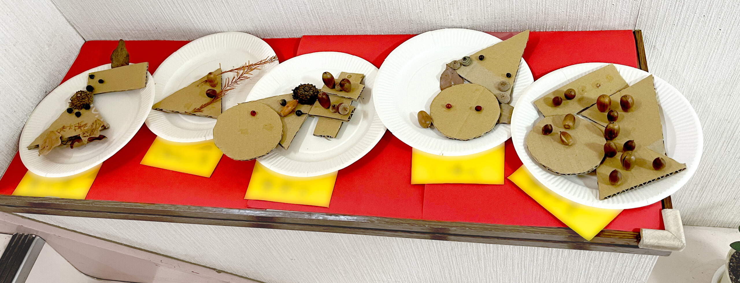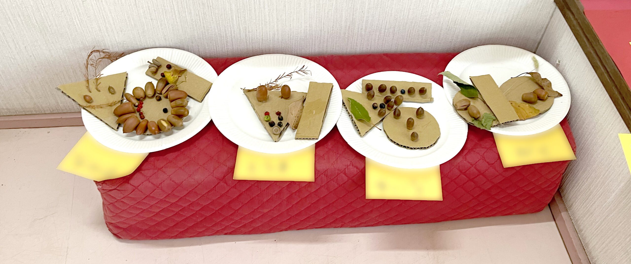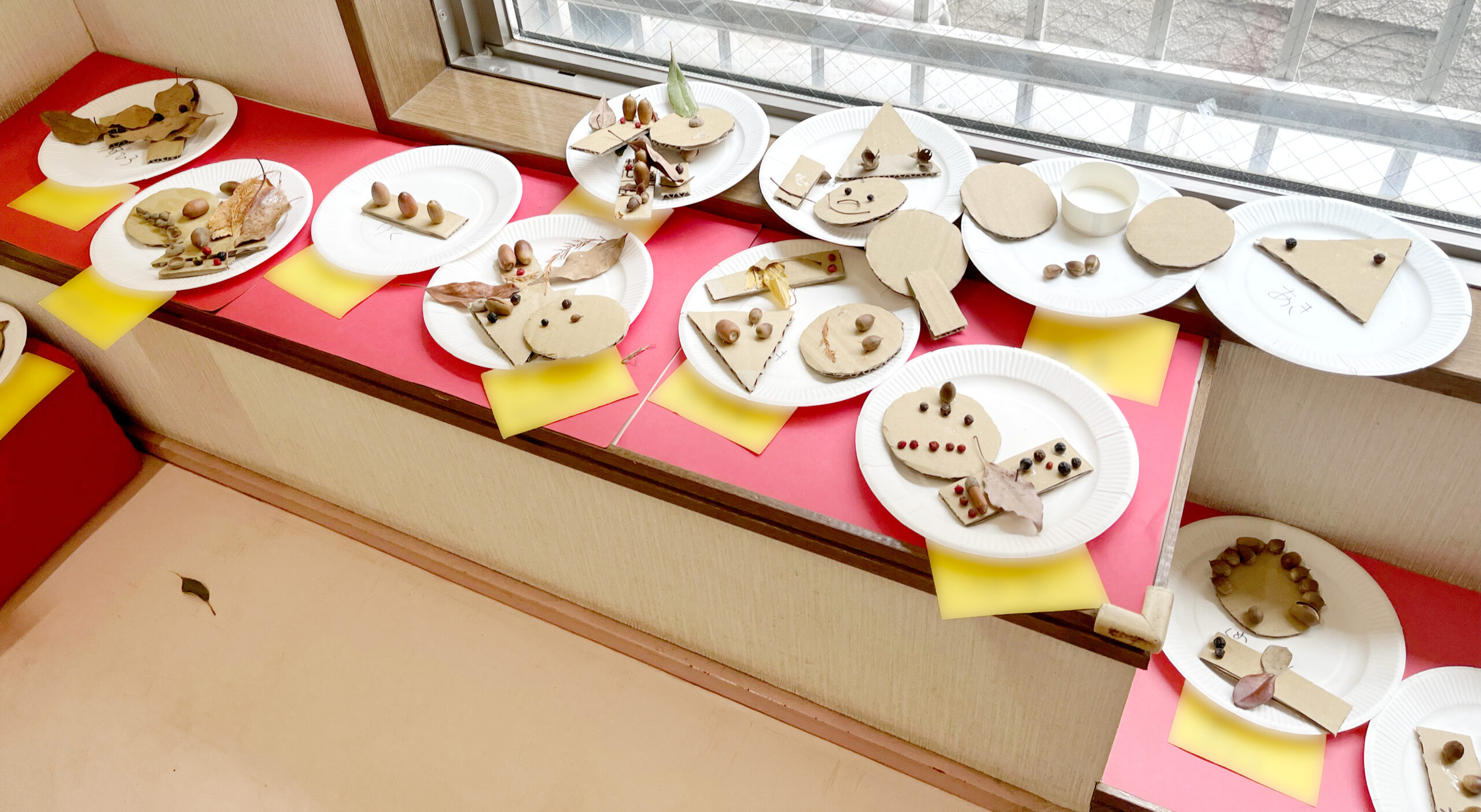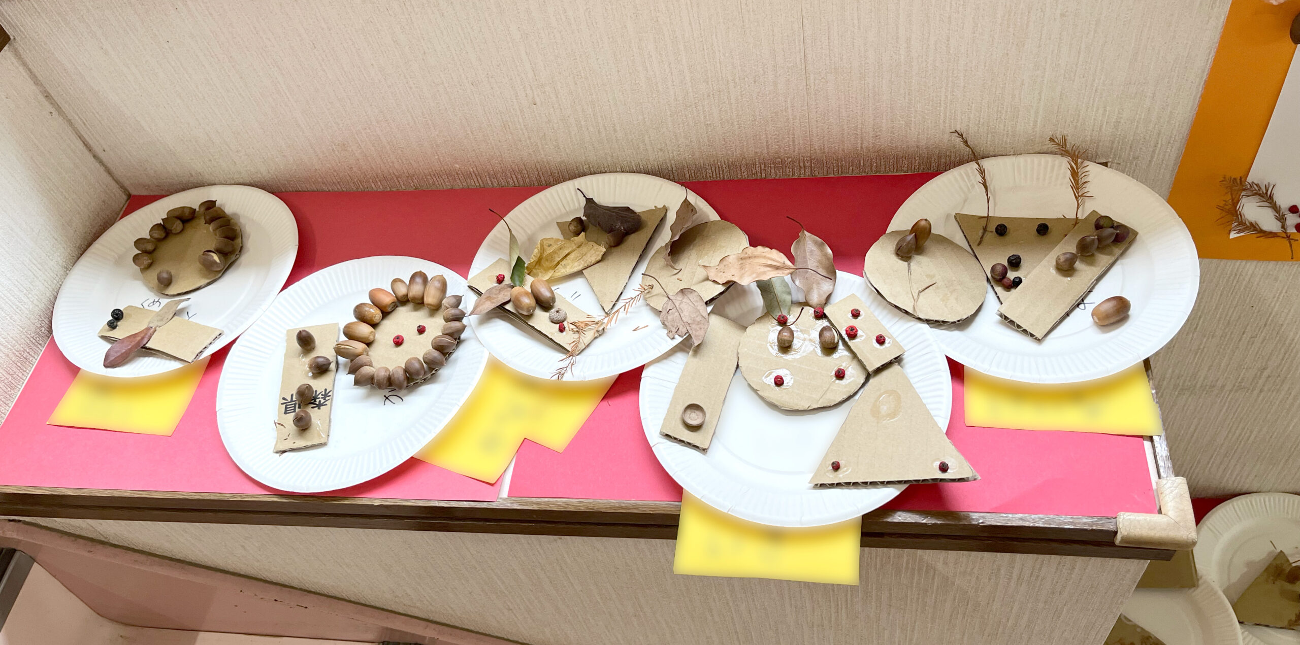 秋の自然物を集めて、ダンボールとのりでペタペタして、造形遊びをしました!