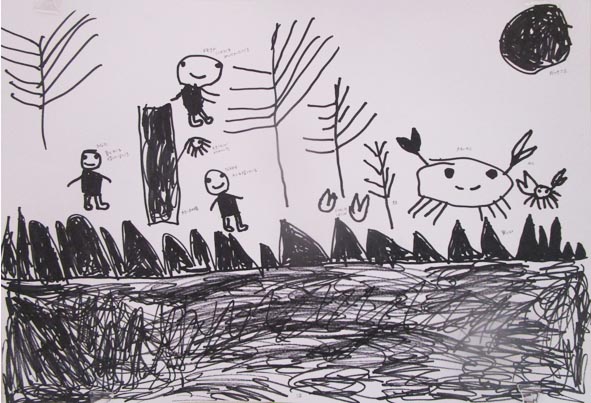 らいおん組は、カニとりの観察画、思い思いの印象に残った様子を絵にしました。