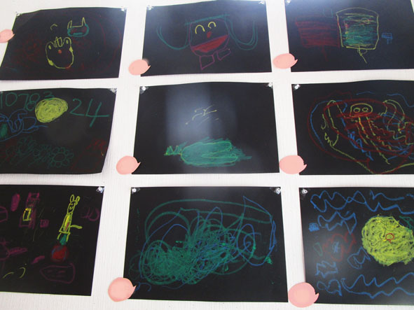 春の造形 2020.04.03 うさぎ組ぱんだ組りす組 りす組「たんぽぽ」(2019年3月30日制作) お花紙をくしゃくしゃして、感覚を楽しみながらつくりました。 うさぎ組「お弁当作り」(2019年3月30日制作) 色紙を切ったり丸めたりして、おにぎりや卵焼きをつくってお弁当にしました。 ぱんだ組「自由画」(2019年3月30日制作) ゲルマーカーで黒い画用紙に絵を描きました。