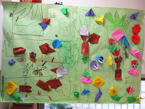 少し難しい所は「ここ、どうやるの?」と訊いたり「ここまで折れたよ!」と保育士に見せながら楽しみました。模造紙の絵は、らいおん組さんが、虫たちが集まれるように描いてくれました!