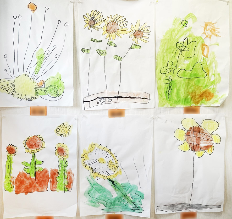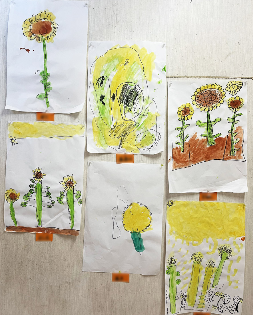 園庭に咲いたひまわりを見て、触れて、お絵描きをしました。