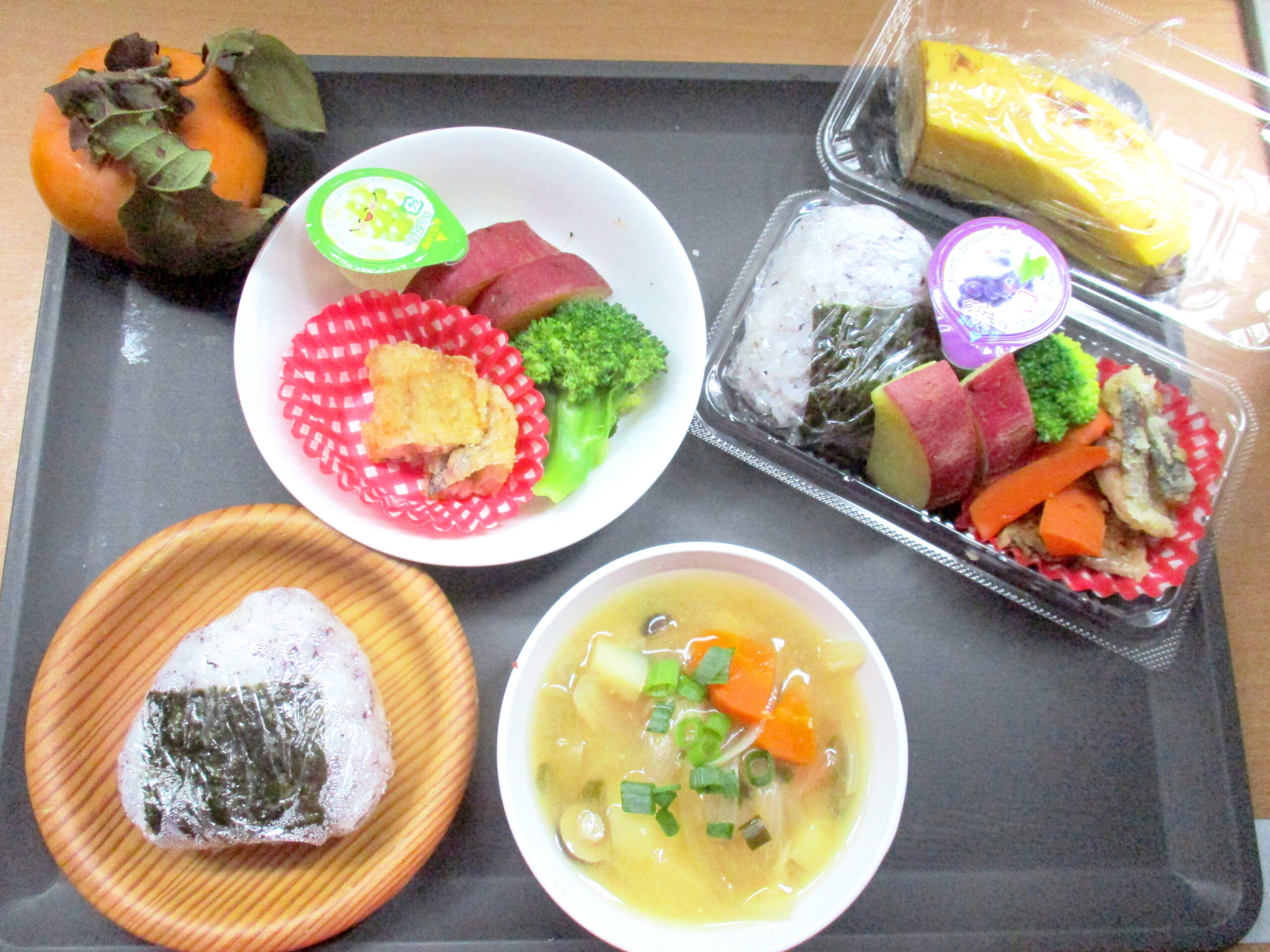 10月のピクニックランチ 2025.11.11 ピクニックランチ 10月のピクニックランチメニュー ゆかりおにぎり、アジの唐揚げ、人参グラッセ、ブロッコリー、ふかし芋、バナナ、ミニゼリー 給食メニュー:ゆかりおにぎり、みそ汁、アジの唐揚げ、ブロッコリー、ふかし芋、ミニゼリー