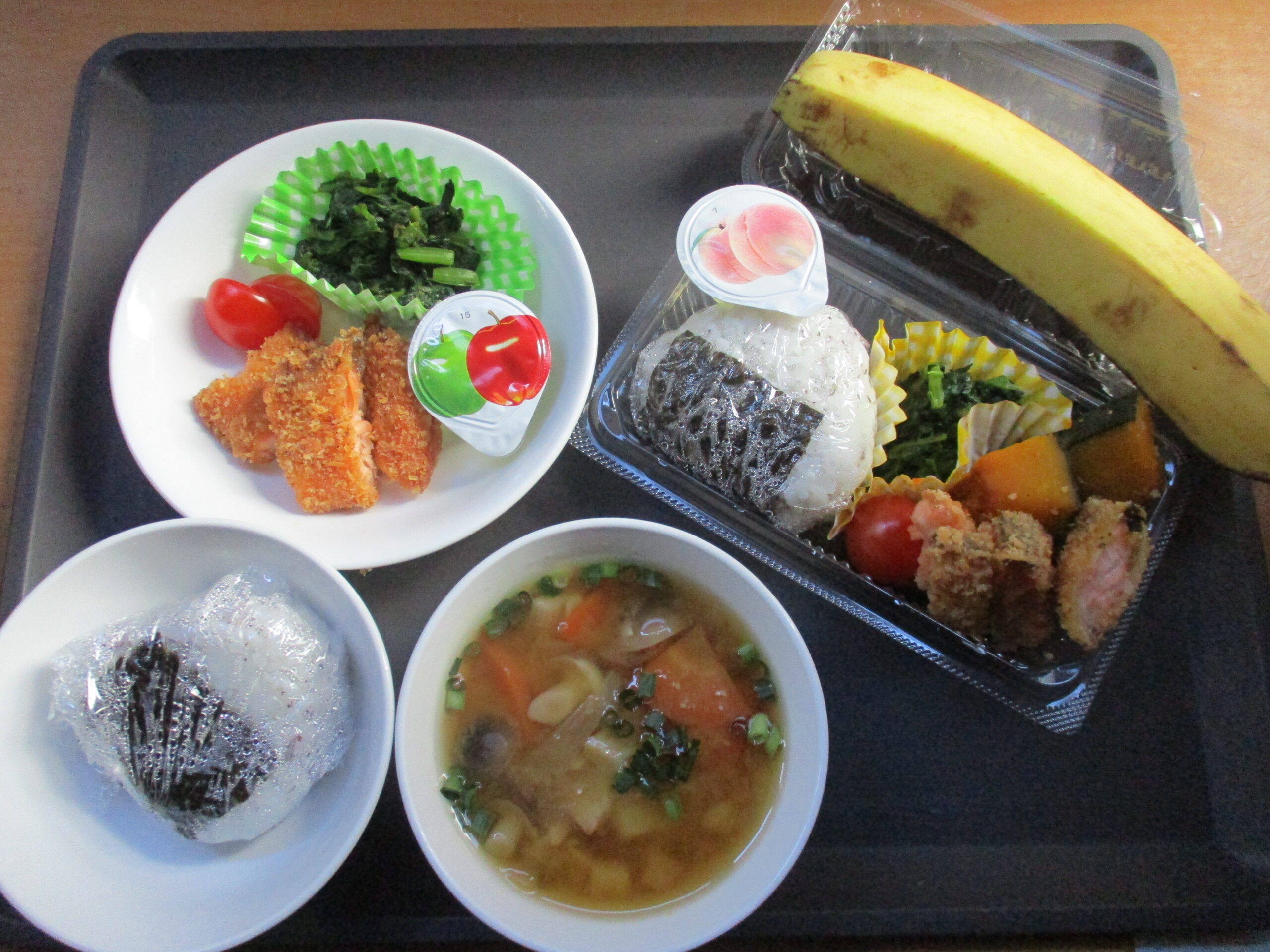1月のピクニックランチ 2026.01.28 ピクニックランチ 1月のピクニックランチメニュー ゆかりおにぎり、サケフライ、ほうれん草のおかか和え、かぼちゃ、ミニトマト、バナナ、ミニゼリー 給食メニュー:ゆかりおにぎり、みそ汁、サケフライ、ほうれん草のおかか和え、ミニトマト、ミニゼリー