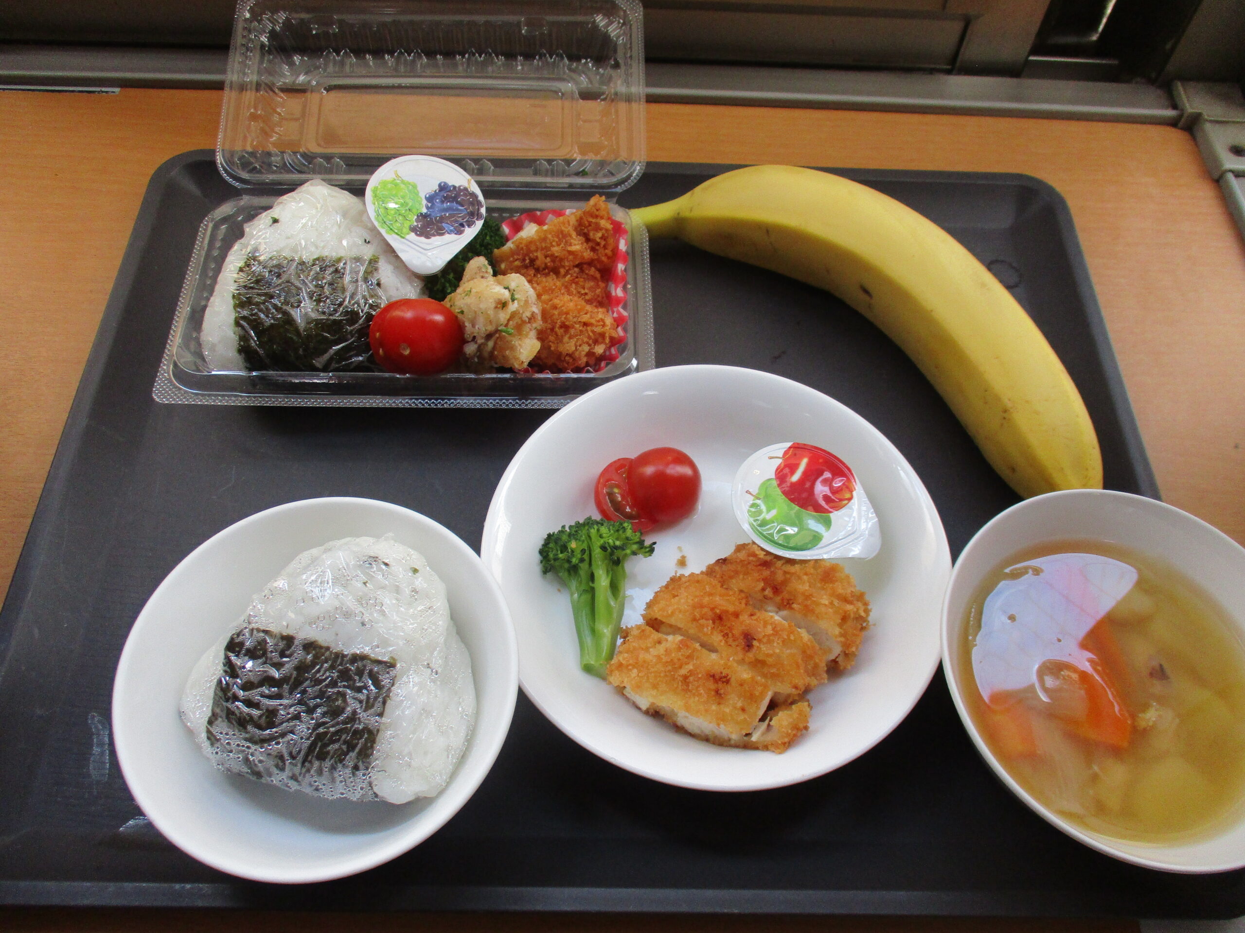 4月のピクニックランチ 2026.04.24 ピクニックランチ 4月のピクニックランチメニュー わかめおにぎり、ささみカツ、フライドたけのこ、ブロッコリー、ミニトマト、ミニゼリー、バナナ 給食 わかめおにぎり、ささみカツ、ブロッコリー、ミニトマト、ミニゼリー、みそ汁
