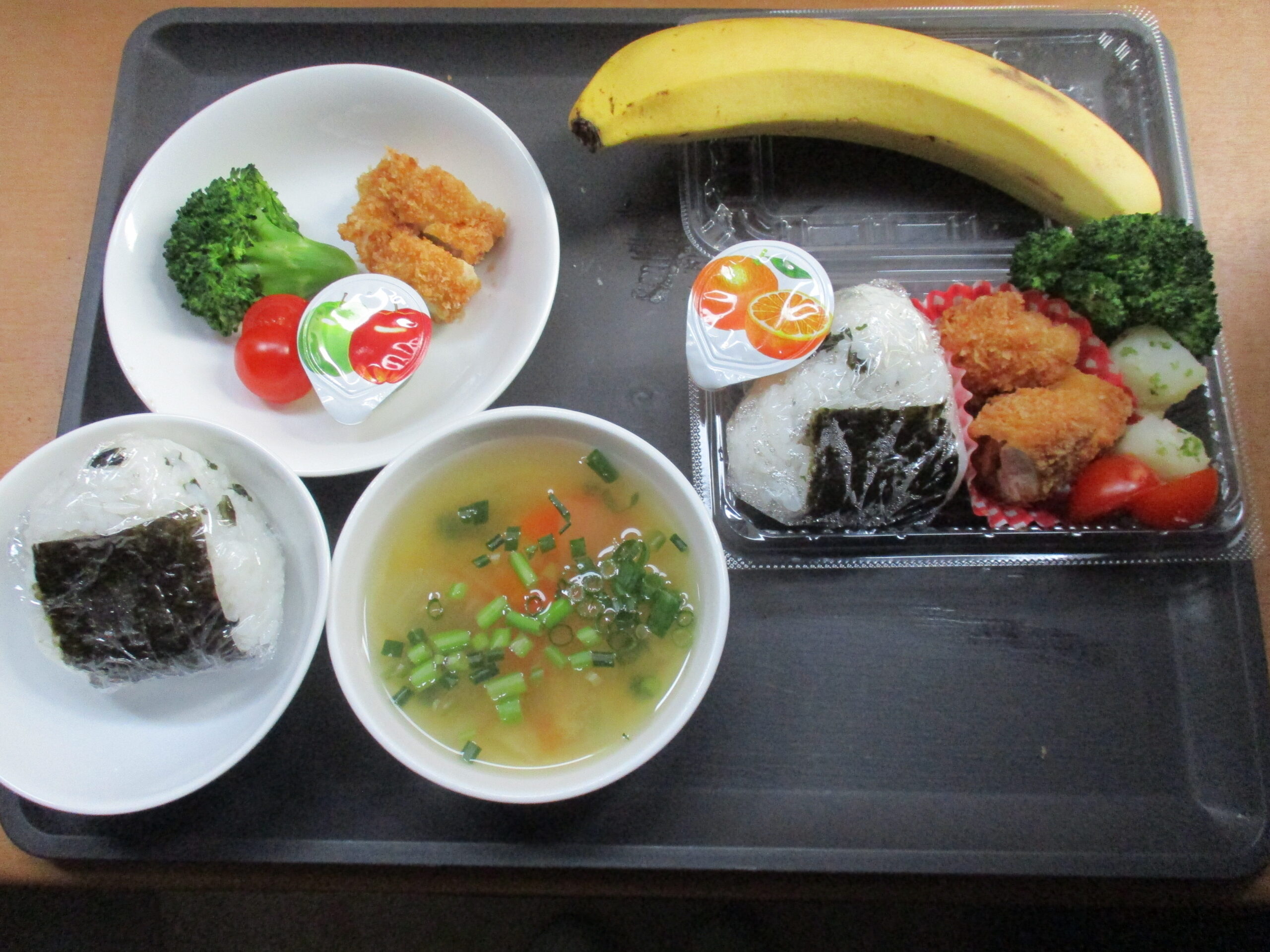 給食メニュー:わかめおにぎり、みそ汁、ささみカツ、ブロッコリー、ミニトマト、ミニゼリー