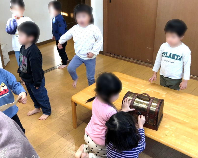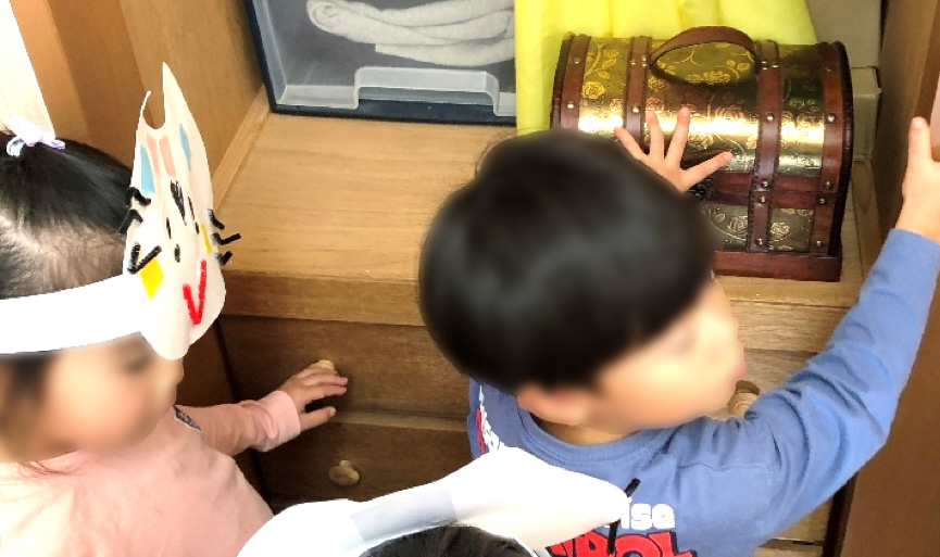 ごっこが終わってもイメージの世界は続いていて、そのまま4階で宝探しをしていると宝箱を発見!