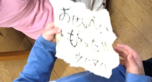 子「おせんべいたべてねってかいて」