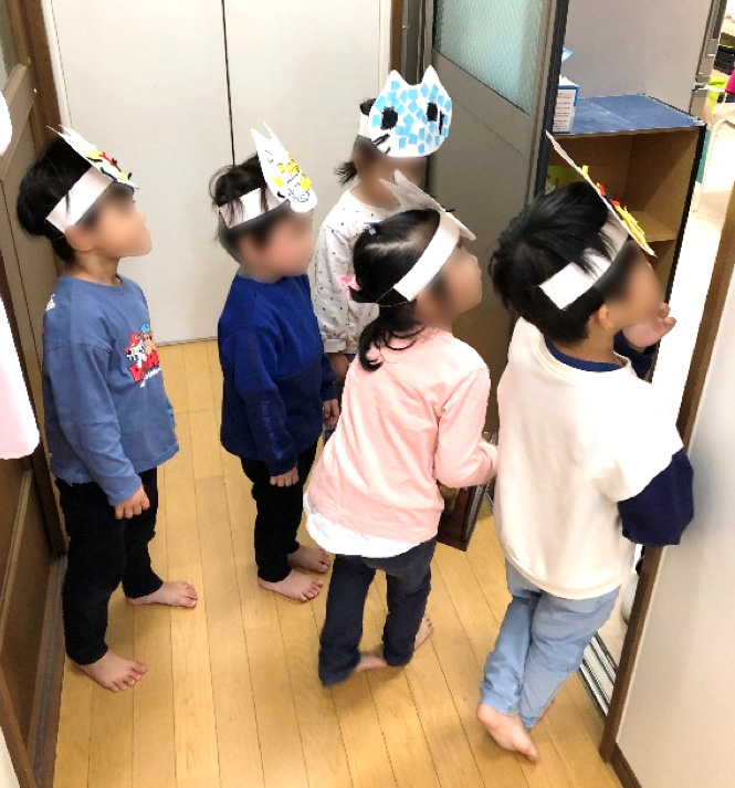 先日作ったねこのお面をつけてなりきり、ウヒアハごっこを楽しみました。