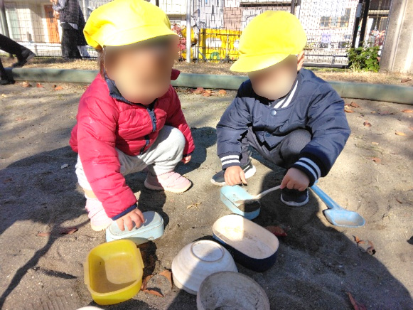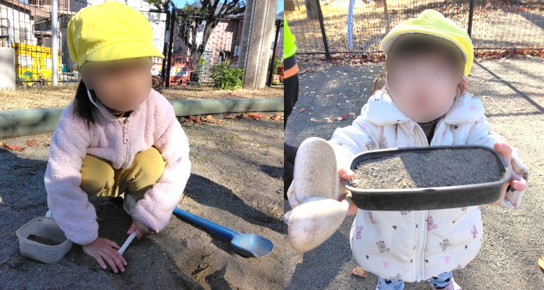 お散歩<ひよこ・りす組> 2025.12.17 散歩 公園はまだまだ秋の色がいっぱい♪ 砂場でお弁当を作ったり、ご飯を作ってご馳走したり、ごっこあそびが広がっていたりす組さん☆ ひよこ組さんもりす組さんを真似っこして、まぜまぜしたり、“どうぞ”と渡してみたりして楽しんでいました♬ 見て!スープ♪ これいれて~♬ みんなで仲よく楽しみました♪
