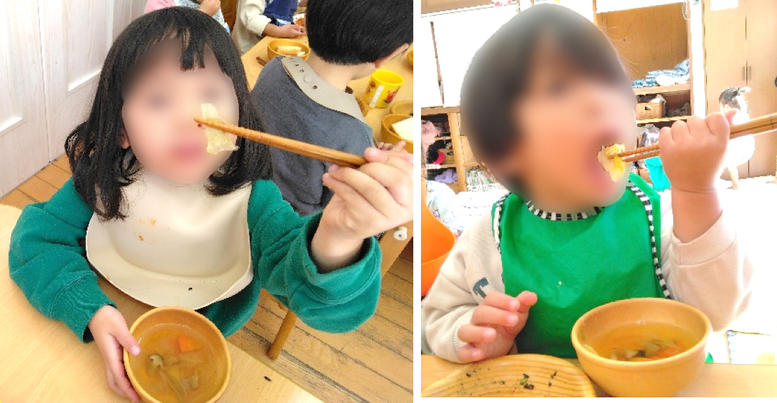 出てくると、「入ってた!」と上手にお箸で挟んで見せてくれたり、野菜が苦手な子も「おいしい!」と 大きなお口で嬉しそうに食べる姿が見られました☆