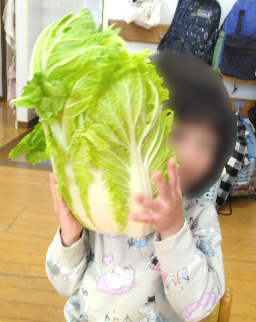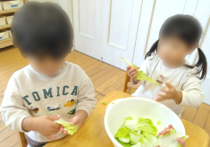 興味いっぱいの様子で「葉っぱの匂いがする」「固いところがある」「こっちは柔らかいよ!」等と気付いたことを言葉にして伝え合っていました。みんなでちぎった白菜が給食のスープに入って