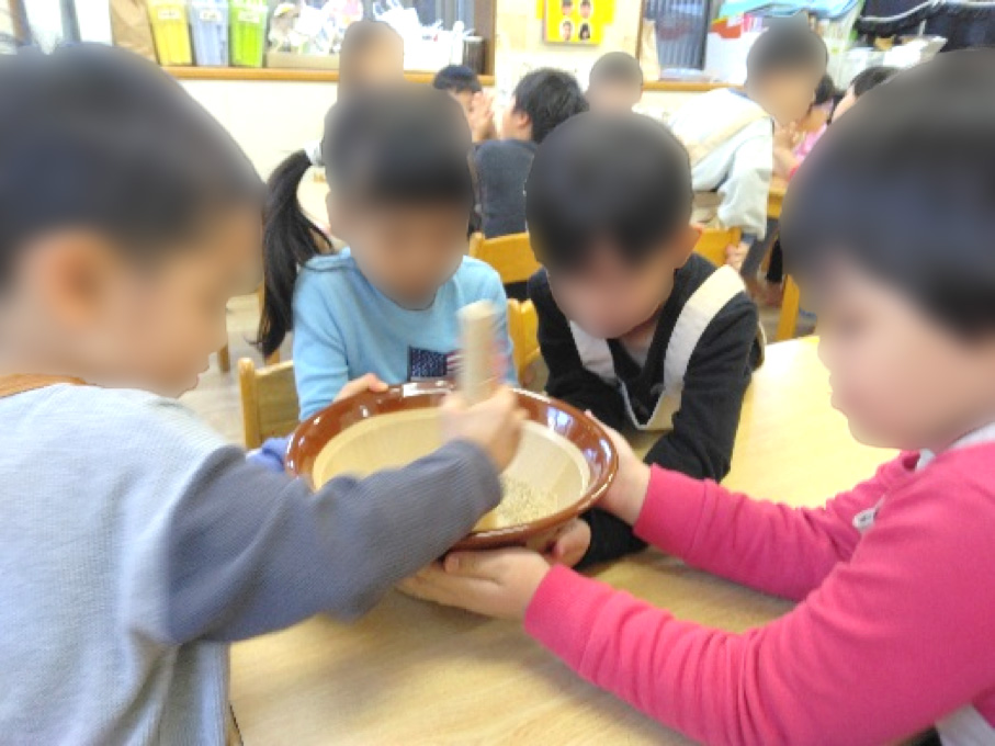 きりん組さんはごますりを。友だちとすりばちを支え合いごまをすることで、ごまのにおいや潰れていく変化などを五感で感じていました。
