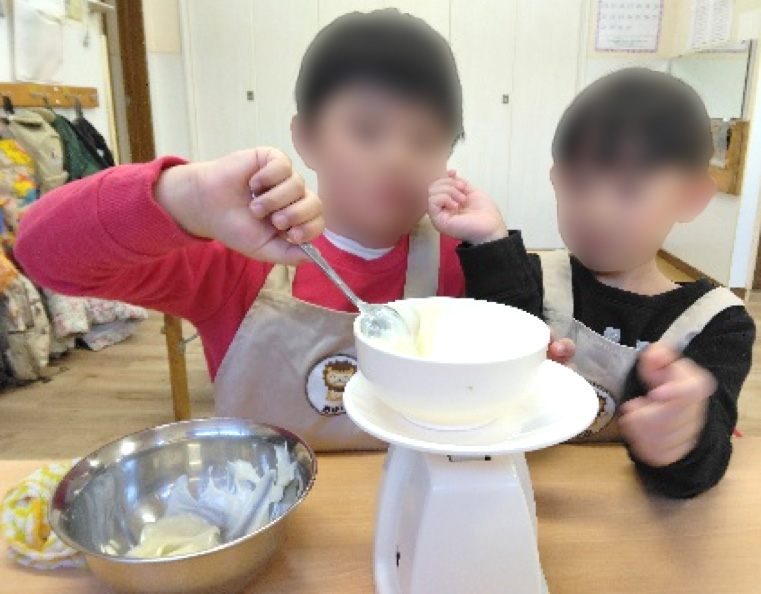 今日は給食のサラダ作りをしました。らいおん組さんは計量を。