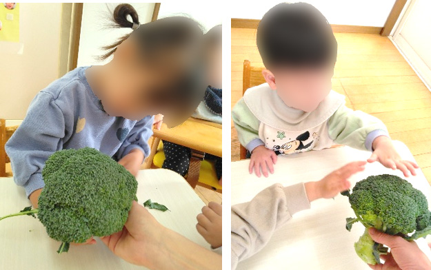 ブロッコリーに指先で触れるとブツブツしている感触や硬さに気付いたり、匂いを嗅いだり、手で葉をちぎってみたり、五感を使って興味津々の子どもたち☆
