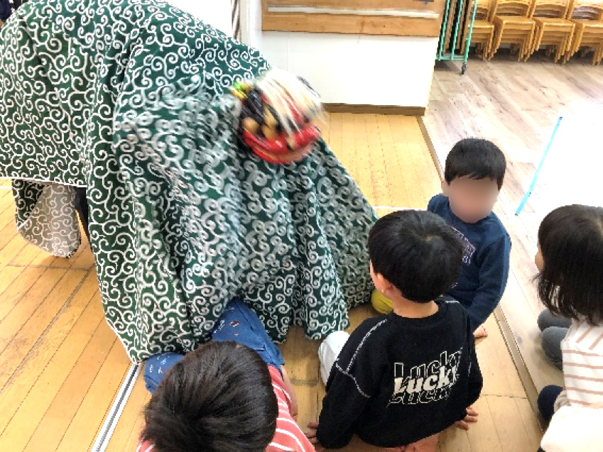 獅子舞さんとの楽しい掛け合いに思わず笑顔になる子どもたち。