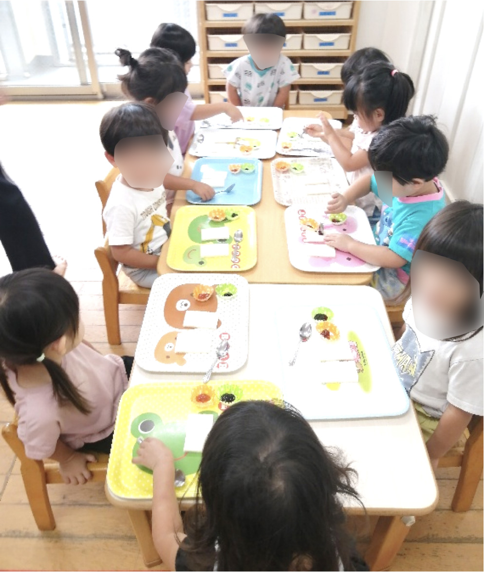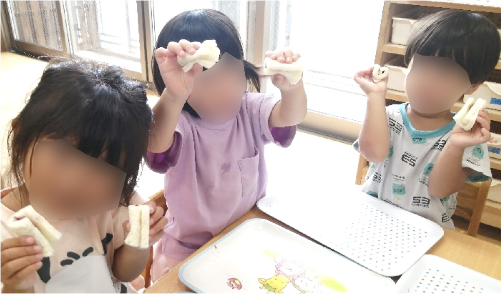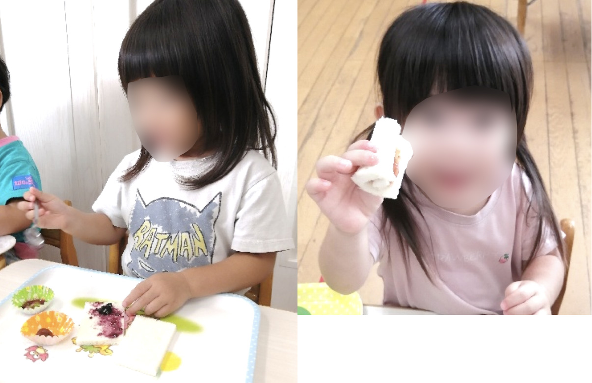 今日は、朝から楽しみにしていたクッキング作り方のお手本を見せると、「早くやりた~い!」との声が上がったので、さっそくクッキング開始!みんな、とても集中していて、上手にジャムを塗ったり、くるくる巻いて、かわいいジャムのサンドウィッチが出来上がりました☆