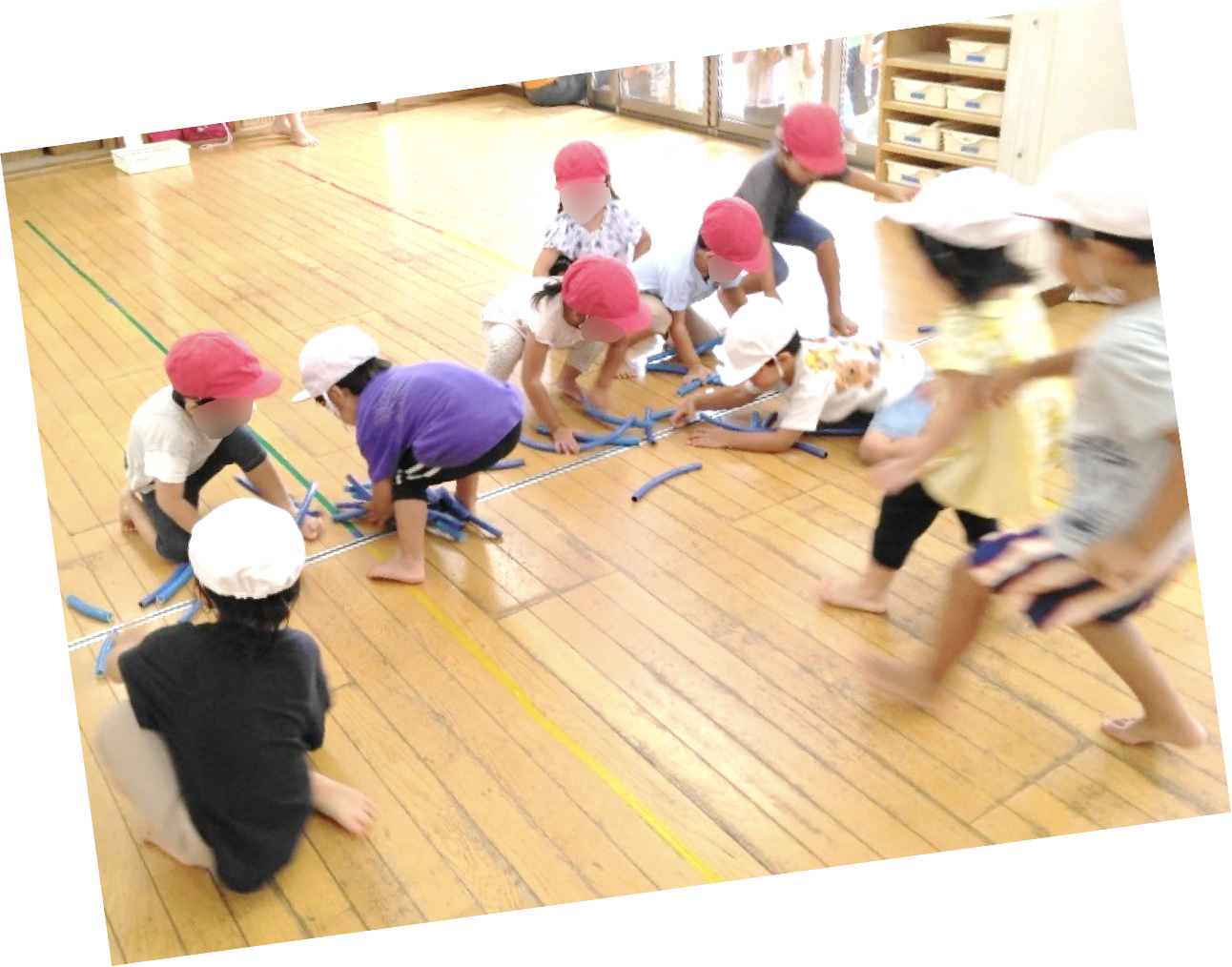 勝負のある遊びも楽しめるようになる時期。今日は2チームに分かれてホースと箱積み木の取り合いっこで勝負しました。始める前から「みんな、がんばるぞー!!」と、やる気満々の子どもたち!よーい、どん!で白熱の戦いが始まりました!