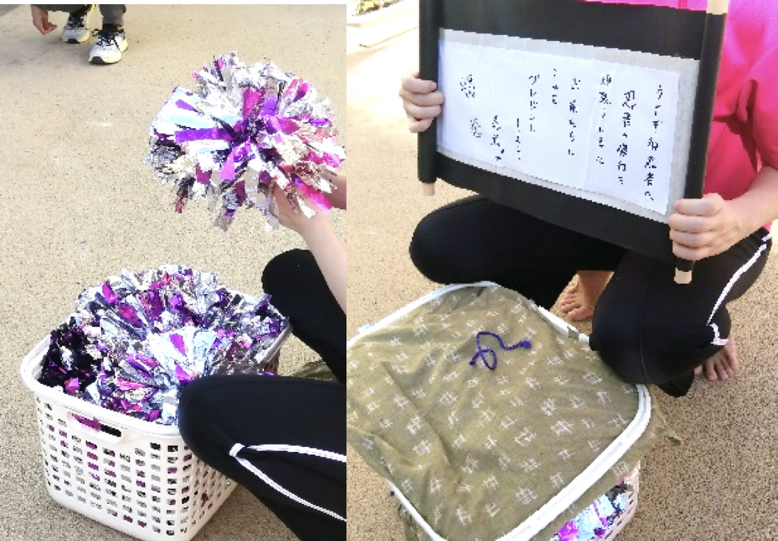 なんと階段に忍者さんからの手紙とプレゼントを発見!中には、キラキラのポンポンが入っていて子どもたちは大興奮☆キラキラ輝くポンポンを持ってのびのびとリズムを楽しみました