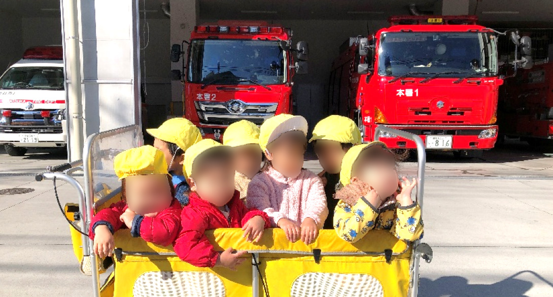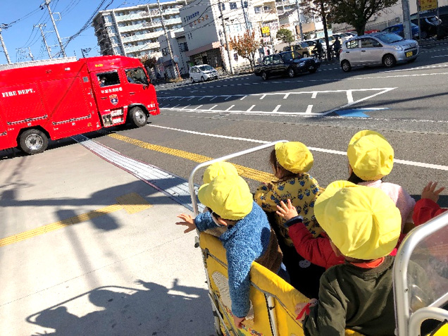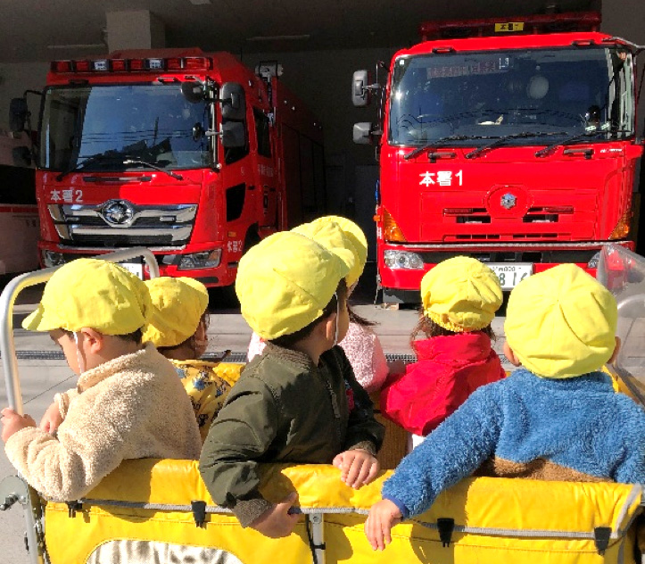 大きさに圧倒されながらも、指をさして“消防車!”と言っている姿もあり、近くで見れて嬉しそうな子どもたちでした♬