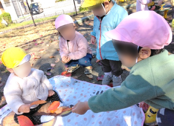 公園では、落ち葉を拾って集めたり、砂場でおままごとをしたり、ダンゴムシ探しをしたり…と、思い思いにじっくりと楽しんでいました。