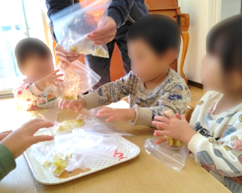 ひよこ・りす組はビニール袋にお芋を入れて手でつぶしました!