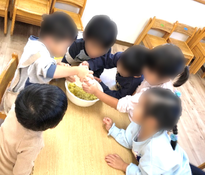さつまいもを潰したり混ぜたりして匂いの変化を楽しみながら作ることが出来ました♪
